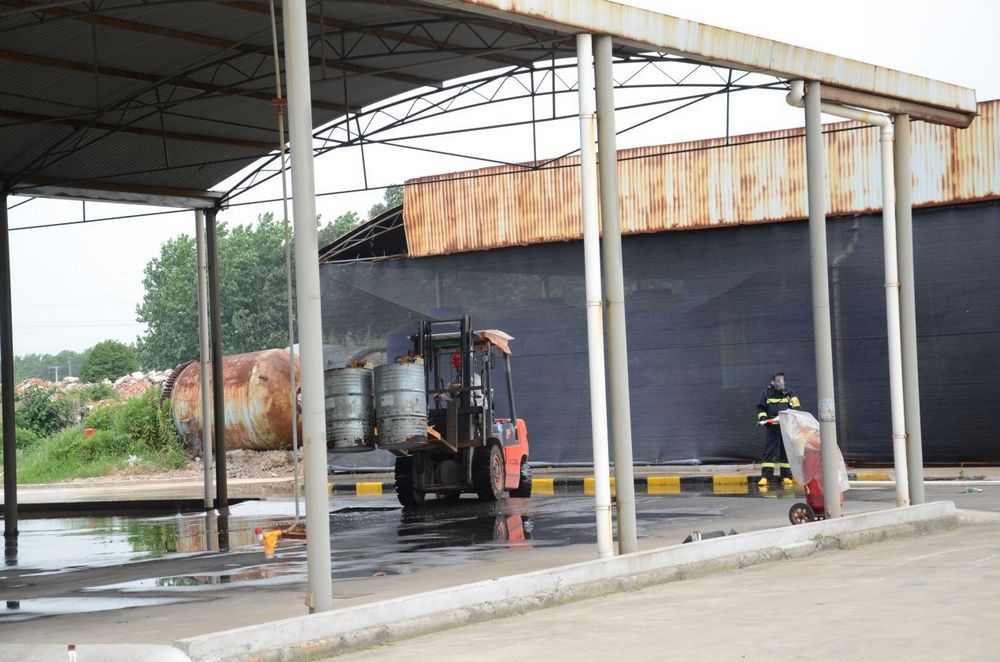 消防搶險組現(xiàn)場接入消防栓,對事故泄漏點噴淋稀釋